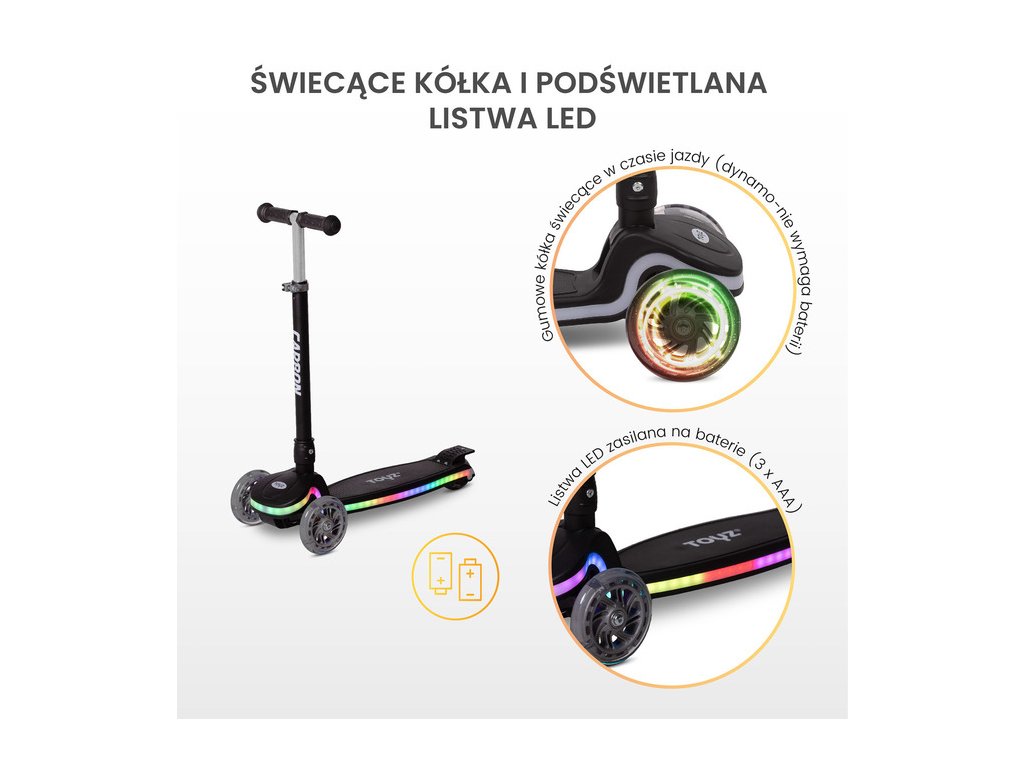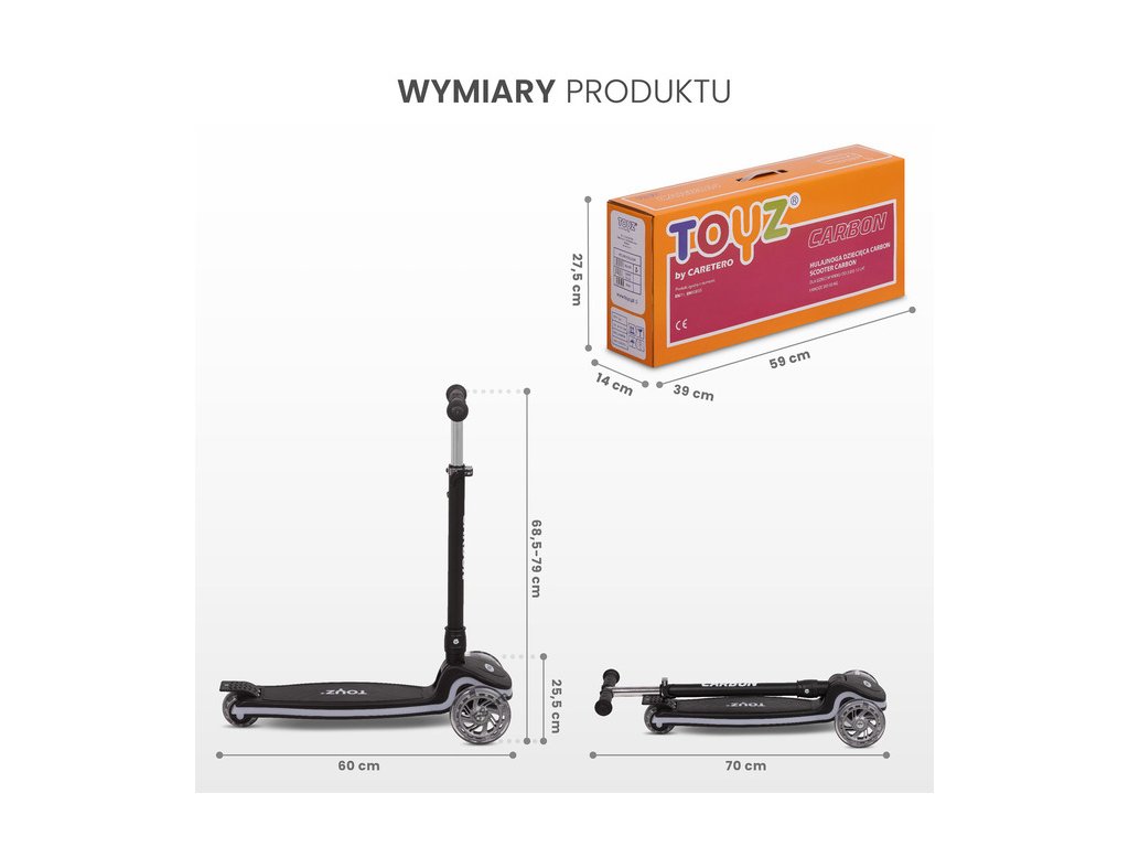 A TOYZ CARBON roller több mint játék – befektetés gyermeke aktív életmódjába. Biztonságot, funkcionalitást és szórakozást egyesít egy elegáns csomagban. A világító hatások örömet szereznek, az állítható kormány biztosítja a hosszú távú használatot, a minőségi konstrukció pedig garantálja a tartósságot. Ajándékozza meg gyermekét a mozgás és a világfelfedezés örömével egy olyan rollerrel, amely vele együtt nő!
