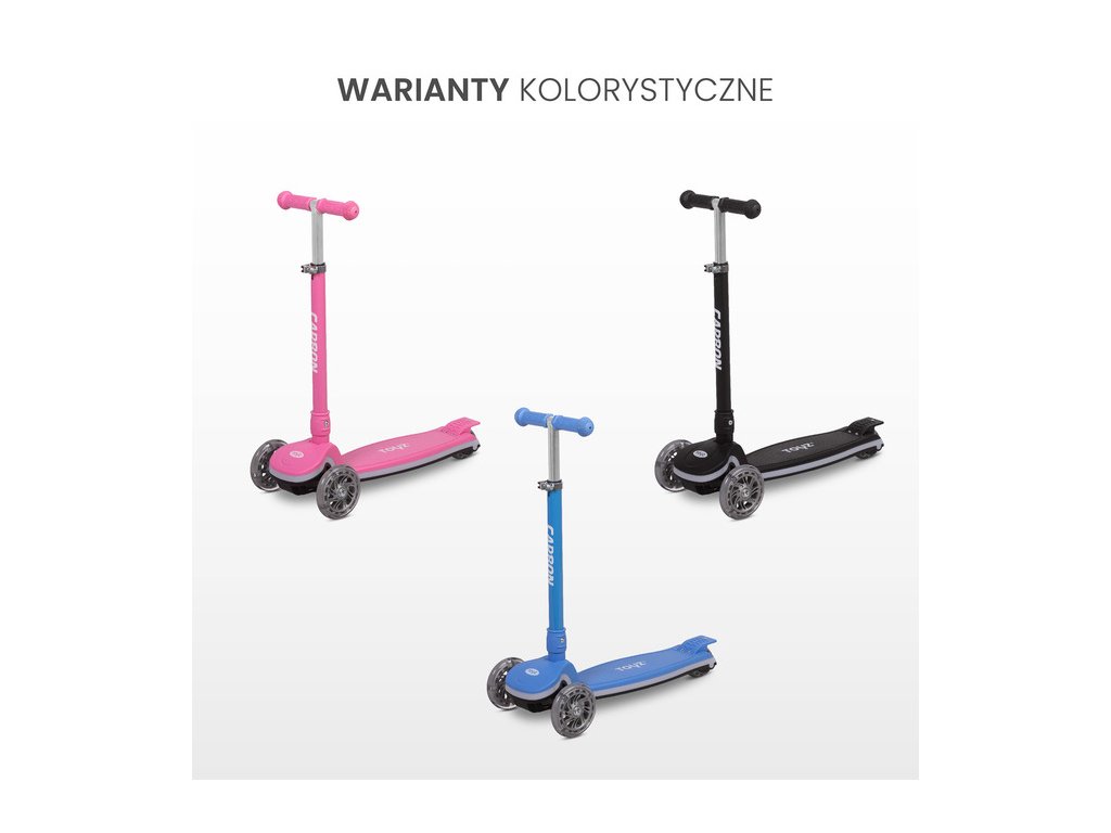 A TOYZ CARBON roller több mint játék – befektetés gyermeke aktív életmódjába. Biztonságot, funkcionalitást és szórakozást egyesít egy elegáns csomagban. A világító hatások örömet szereznek, az állítható kormány biztosítja a hosszú távú használatot, a minőségi konstrukció pedig garantálja a tartósságot. Ajándékozza meg gyermekét a mozgás és a világfelfedezés örömével egy olyan rollerrel, amely vele együtt nő!