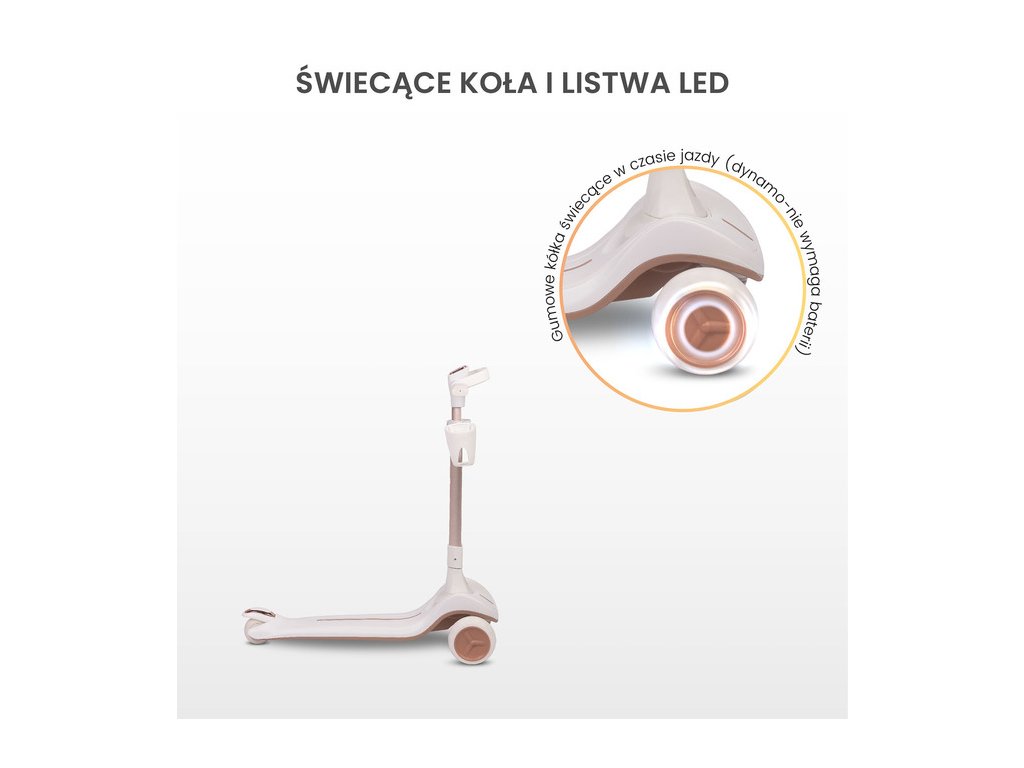A TOYZ SATURA nem csak egy egyszerű roller – ez egy komplex fejlesztő eszköz gyermeke számára. Kombinálja a szórakozást a tanulással, támogatja a fizikai aktivitást és fejleszti a motoros készségeket. A lenyűgöző LED fények növelik a vonzerőt és minden menetből felejthetetlen élményt varázsolnak, különösen alkonyatkor vagy este.