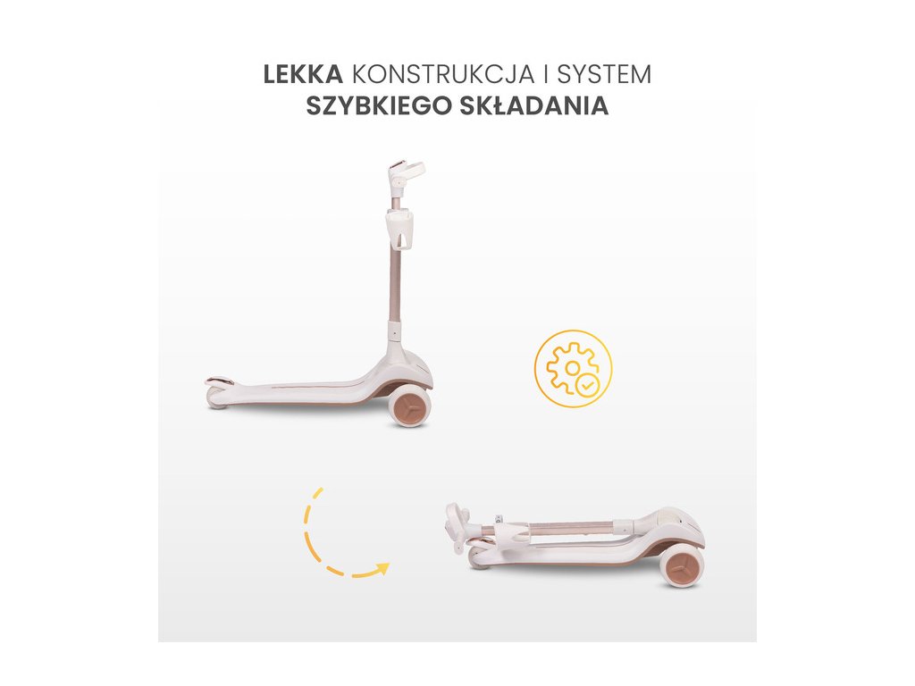 A könnyű konstrukció (körülbelül 2,6 kg) lehetővé teszi a gyerekek számára a könnyű manőverezést és a roller önálló cipelését. A gyors összecsukási rendszer egyetlen mozdulattal összecsukhatóvá teszi a rollert, ami ideális: