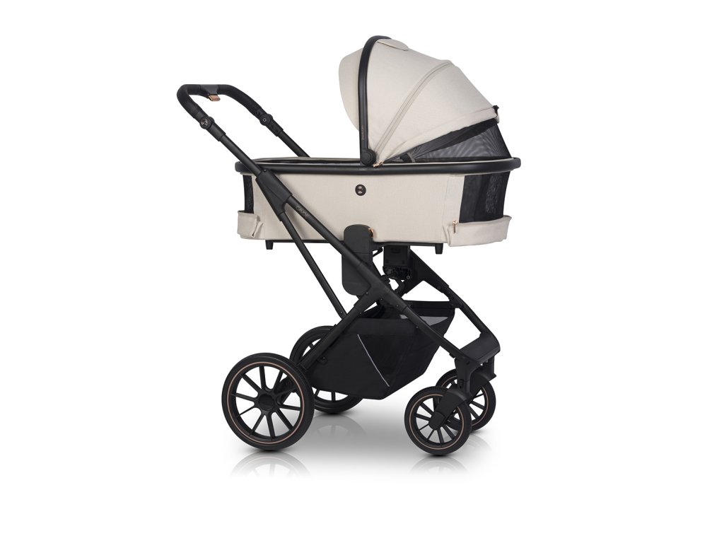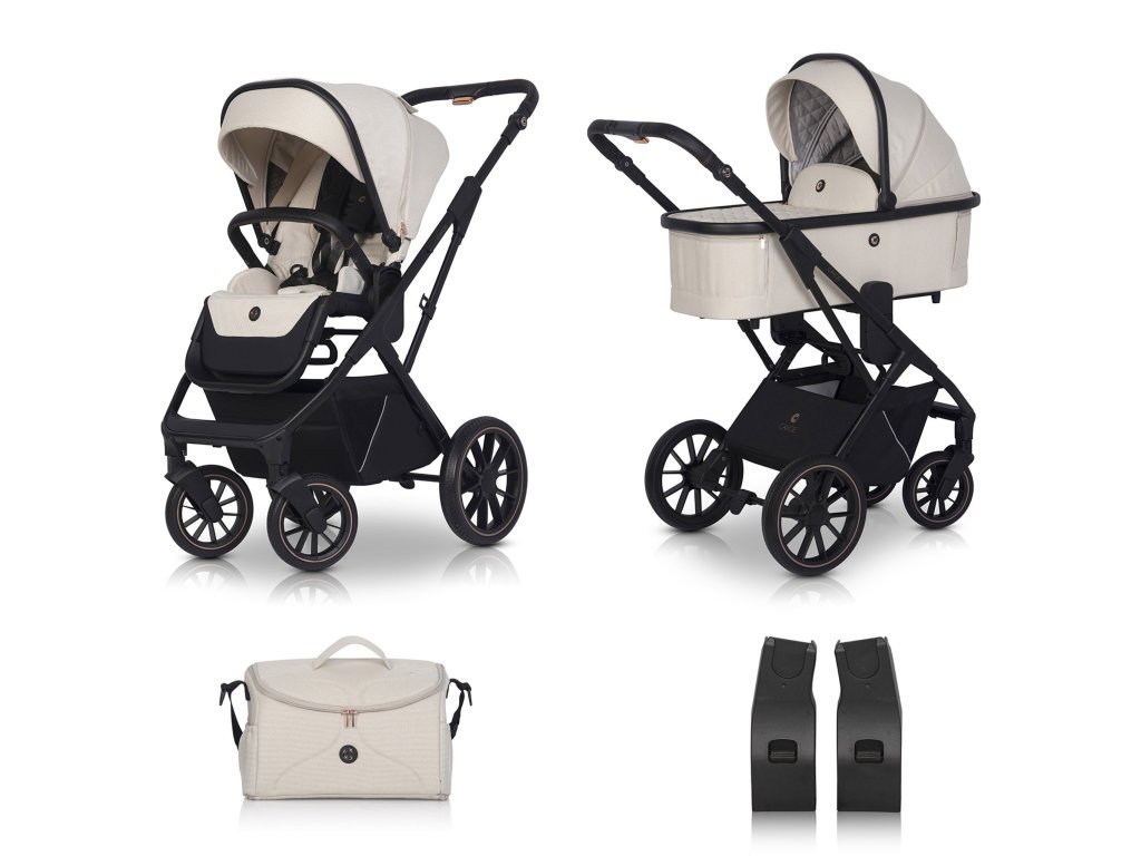 - 2 az 1-ben szett: Tartalmaz egy babakocsit, egy mély mózeskosarat, egy táskát és univerzális autósülés adaptereket.