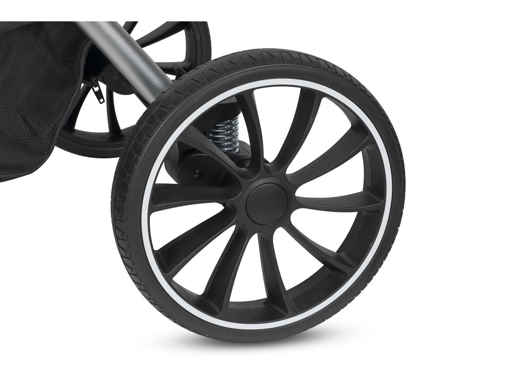 - Tartósság és stílus: A babakocsi modern, szennyeződésálló és könnyen karbantartható anyagból készült.