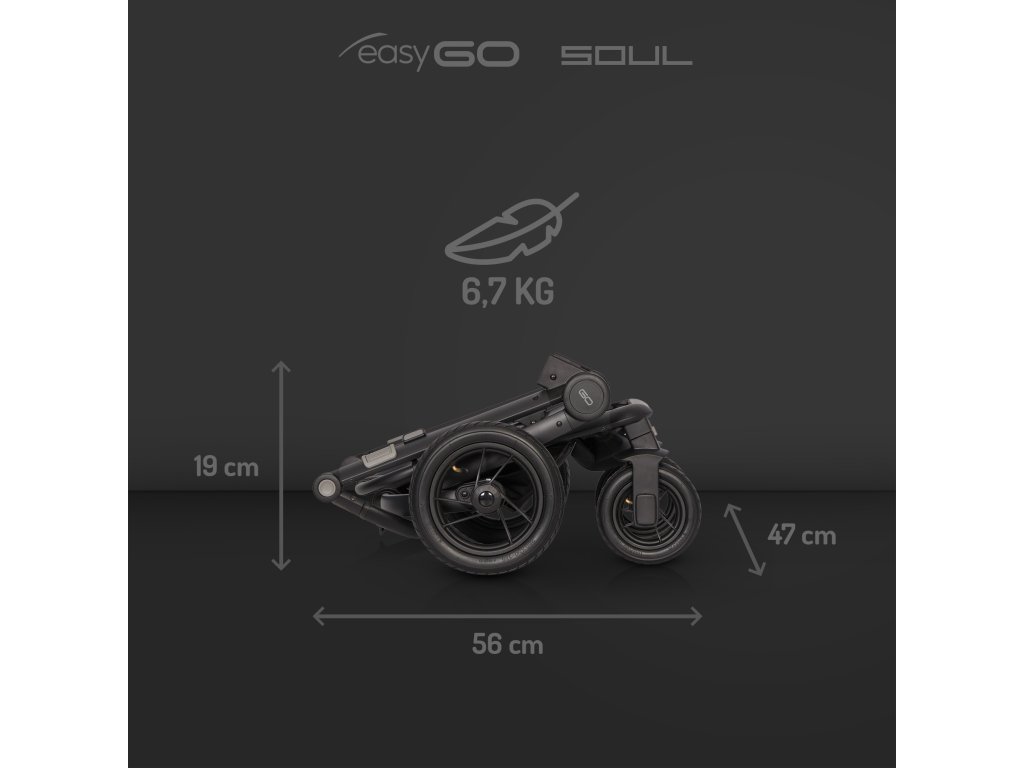 Felejtse el a nehéz és ormótlan babakocsikat. Az EasyGo Soul-t a modern szülők számára tervezték, akik mindig mozgásban vannak. A váz teljes súlya a mély Smart Fold mózeskosárral és a felfújható kerekekkel együtt... csak 10,5 kgRáadásul az összecsukás hihetetlenül egyszerű és intuitív. Mind a váz, mind a mózeskosár nagyon kompakt méretre összecsukható. Meglepődsz majd, milyen kevés helyet foglal a Soul az autó csomagtartójában vagy a folyosón. Az összecsukott váz automatikus zárásának köszönhetően a szállítása gyerekjáték.