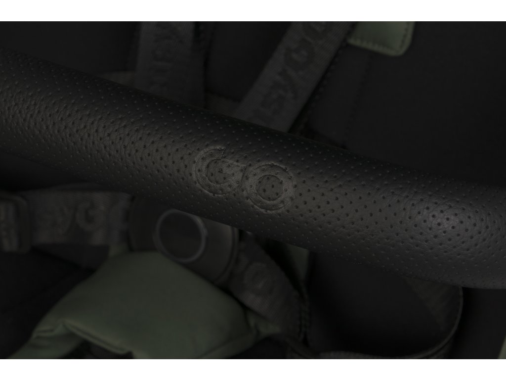 - Stílusos konstrukció: A fogantyú és a védőkorlát perforált mintázatú és logóval ellátott eko-bőrrel van bevonva, ami sportos megjelenést kölcsönöz a babakocsinak.