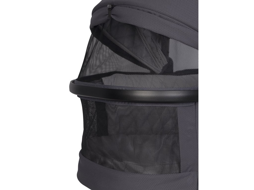 Az elülső részen található nagy, zárható panoráma szellőzőpanelNyitáskor kellemes szellőt hoz létre, amely hűsíti a belsejét anélkül, hogy a babát közvetlen huzatnak tenné ki. Ez a panel ablakként is szolgál, amelyen keresztül a kíváncsi baba hason fekve megfigyelheti a körülötte lévő világot.