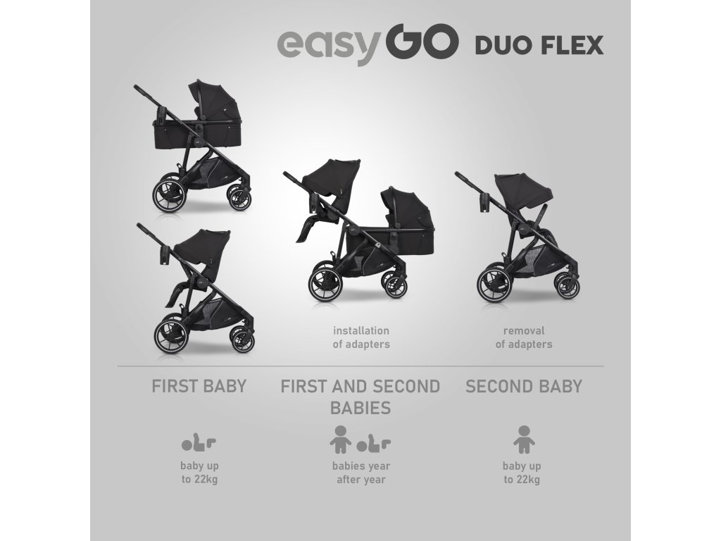 EasyGo DUOFLEX forradalmi megoldást jelent a modern családok számára. Ez a multifunkcionális babakocsi használható klasszikus babakocsi egy gyermeknek (sport változatban vagy 2 az 1-ben változatban egy mély mózeskosárral és egy sportüléssel), és amikor a család egy második gyermekkel bővül, egyszerűen átalakítható babakocsi két gyermeknek anélkül, hogy további alkatrészeket kellene vásárolni.