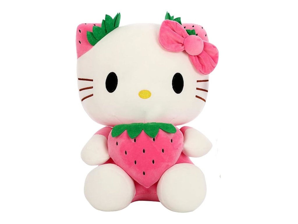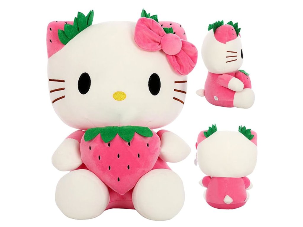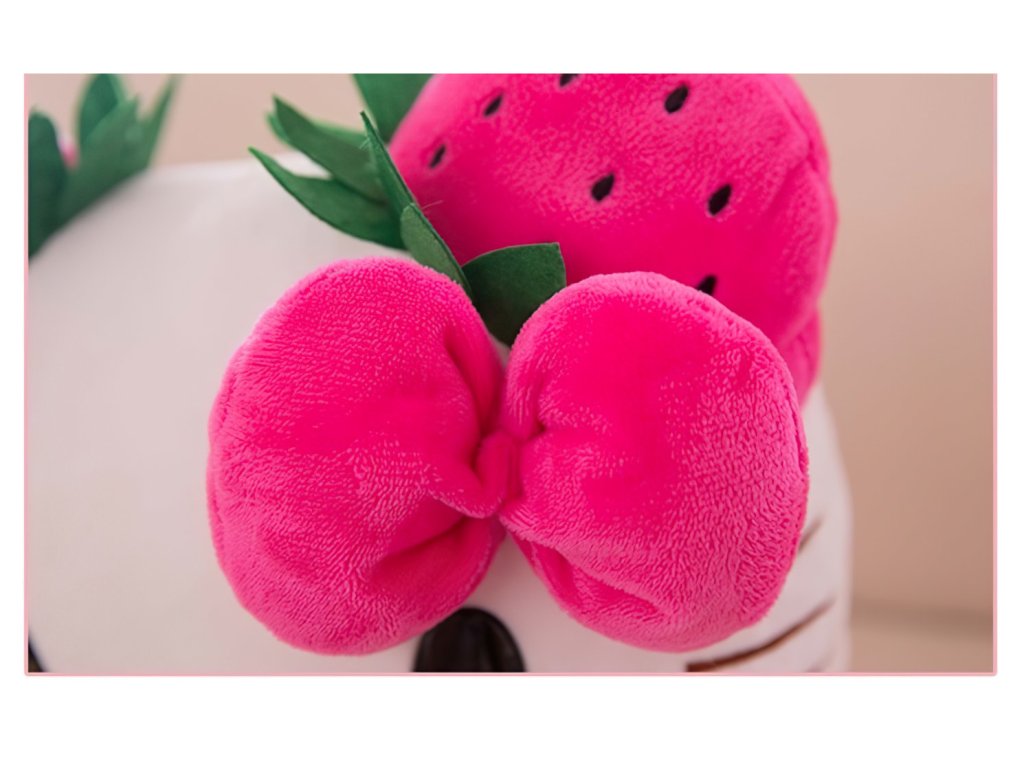 Aranyos Hello Kitty plüssjáték val veleper magassággal 22 cm Ideális ajándék fiatal és idős rajongóknak ikonikus karakter. Hello Kitty Rózsaszín ruhát visel, és a kezében egy jelentőségteljes eper, amely játékos és vidám megjelenést kölcsönöz a játéknak. Tipikus íj van a fején, ezúttal be eper stílusban, ami tovább hangsúlyozza cukiságának összbenyomását.
