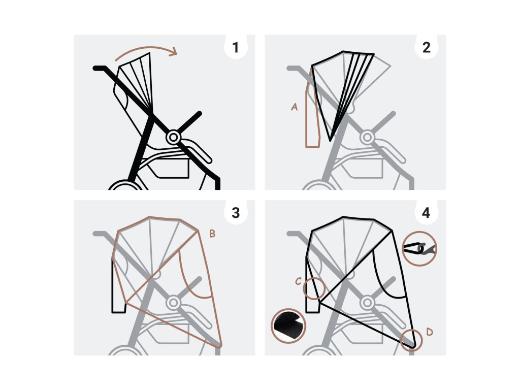 1. Hajtsa ki a huzatot, és helyezze a babakocsira úgy, hogy a szélei egy síkban legyenek a vázzal.