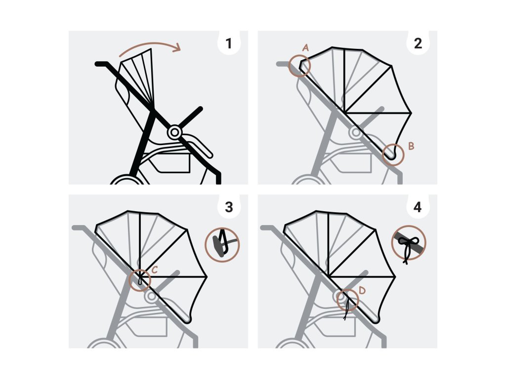Ezt a terméket csak felnőtt használhatja. Használat előtt győződjön meg arról, hogy a huzat biztonságosan rögzítve van, és hogy a gyermek szabadon szellőzik. Ne takarja le a huzatot más anyaggal, és ne helyezzen rá semmilyen tárgyat. Erős szélben óvatosan használja. Ha bármilyen sérülést észlel, azonnal cserélje ki a terméket. Kizárólag kézzel mossa langyos vízzel és enyhe mosószerrel. Árnyékos helyen szárítsa. Kerülje a hőforrásokat és a nyílt lángot.