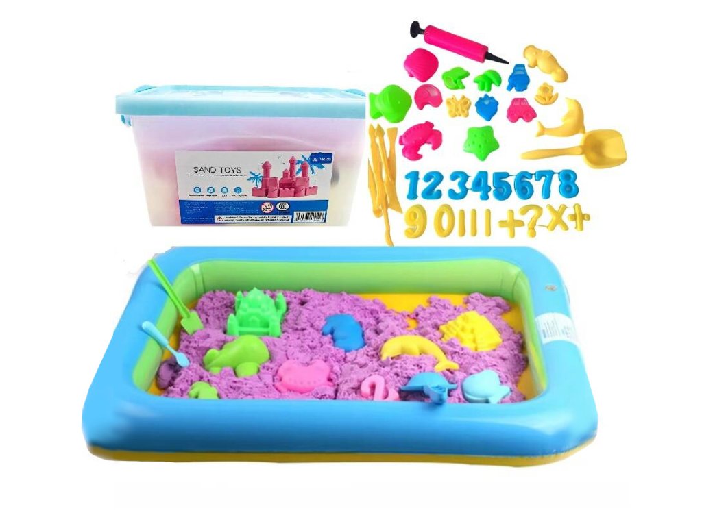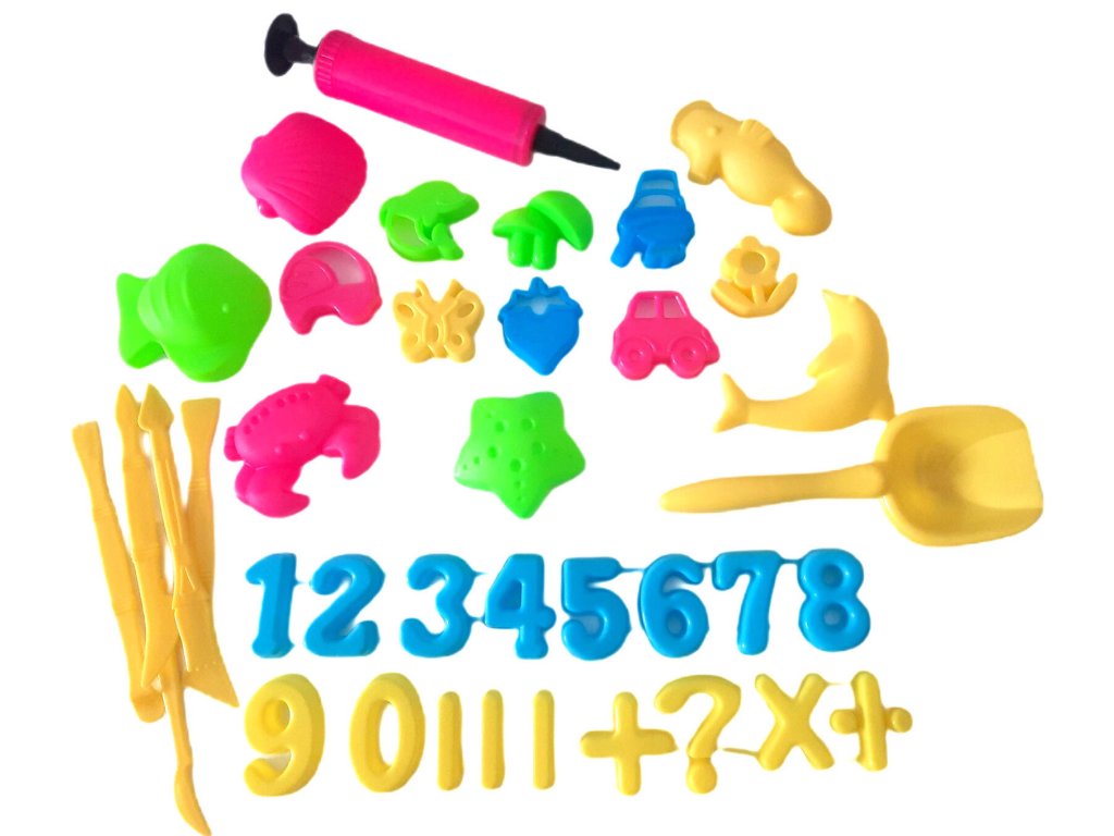A kinetikus homokot különféle formák, számok, matematikai szimbólumok és modellező eszközök egészítik ki, amelyek segítségével kastélyokat, állatokat, tengeri élőlényeket és egyéb kreatív alkotásokat hozhat létre. A mellékelt műanyag spatulák és hengerek segítségével a gyerekek könnyedén formálhatják és díszíthetik alkotásaikat. A készlet tartalmaz egy kis kézi pumpát is, amivel pár perc alatt könnyedén felfújhatod a játszóteret.