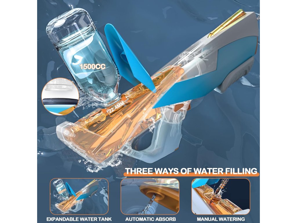 A fegyver abból készülttartós ABS műanyag, ami könnyű, de elég erős az intenzív játékhoz. Önfelszívó mechanizmus lehetővé teszi a gyors vízutántöltést szétszerelés vagy bonyolult kezelés nélkül. Csak mártsd a pisztoly hegyét a vízbe, és a víz... automatikusan szar vissza a tálcára.