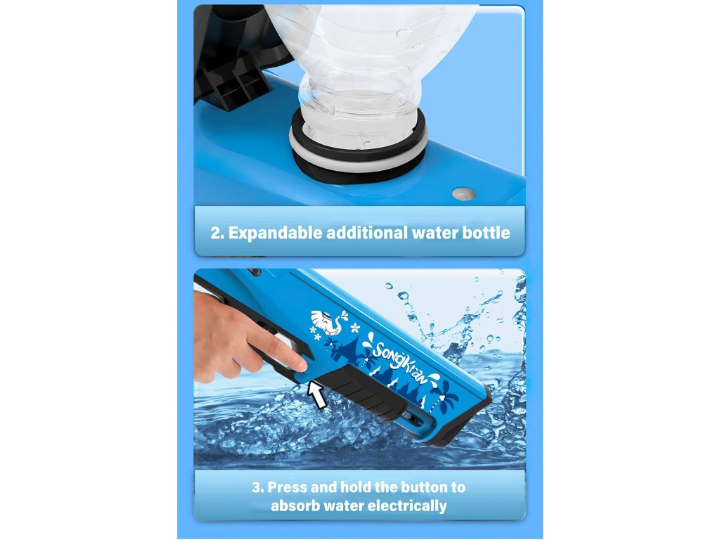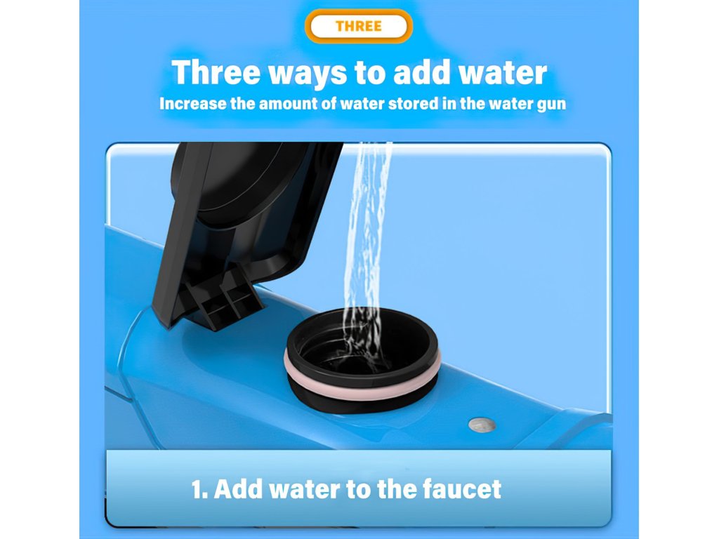 Eztvízipisztoly három egyszerű újratöltési módot kínál víz, beleértve a csapból történő töltés lehetőségét is. A kibővített tartályrendszer nagyobb térfogatú tárolást tesz lehetővé víz, ami kevesebb megszakítást és több szórakozást jelent. Hagyományos PET palackokkal is kompatibilis, így mindig lesz kéznél egy tartály.